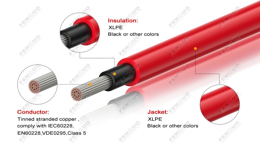FENGGUO® solar dc wire is a highly flexible cable specially designed for connecting photovoltaic solar systems. It has obtained multiple international certifications such as TUV/UL/IEC/CE/RETIE and complies with UL4703, IEC62930, and EN50618/CPR standards. It is suitable for many different solar power fields such as large-scale solar power stations, rooftop solar power stations, and water-surface floating power stations. This versatile solar cable is designed to meet the different needs of the solar industry. It is suitable for various harsh indoor and outdoor environments such as roofs, deserts, lakes, seasides, and mountains (climates with high temperatures, high humidity, and high salt content). Stable and good connection performance ensures the long-term safe operation of the photovoltaic system, effectively reducing the failure rate and later operation costs of the photovoltaic system. Get your PV installations up and running efficiently and safely. Achieving sustainable and successful PV profitability.